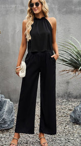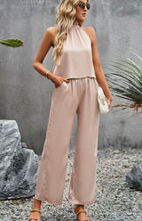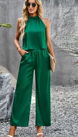 This solid-colored women's outfit set features a collarless top with a sleeveless design for optimal comfort during warm weather. The flowing satin material and relaxed fit ensure ease of movement, while the pants' length adds sophistication to this breezy look.