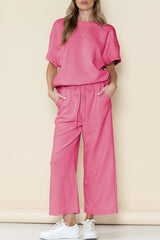 Elevate your casual wardrobe with this women's loose-fit textured T-shirt and drawstring pants set. Enjoy customizable comfort and a chic, relaxed silhouette, perfect for any laid-back day.