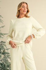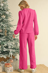 This two-piece set offers a perfect balance of texture, comfort, and style. The puff sleeve top adds an elegant, fashion-forward edge, while the matching pants complete the coordinated look. Crafted from soft stretch fabric, it provides flexibility and ease for all-day wear. Ideal for casual outings or relaxed gatherings where comfort meets effortless sophistication.